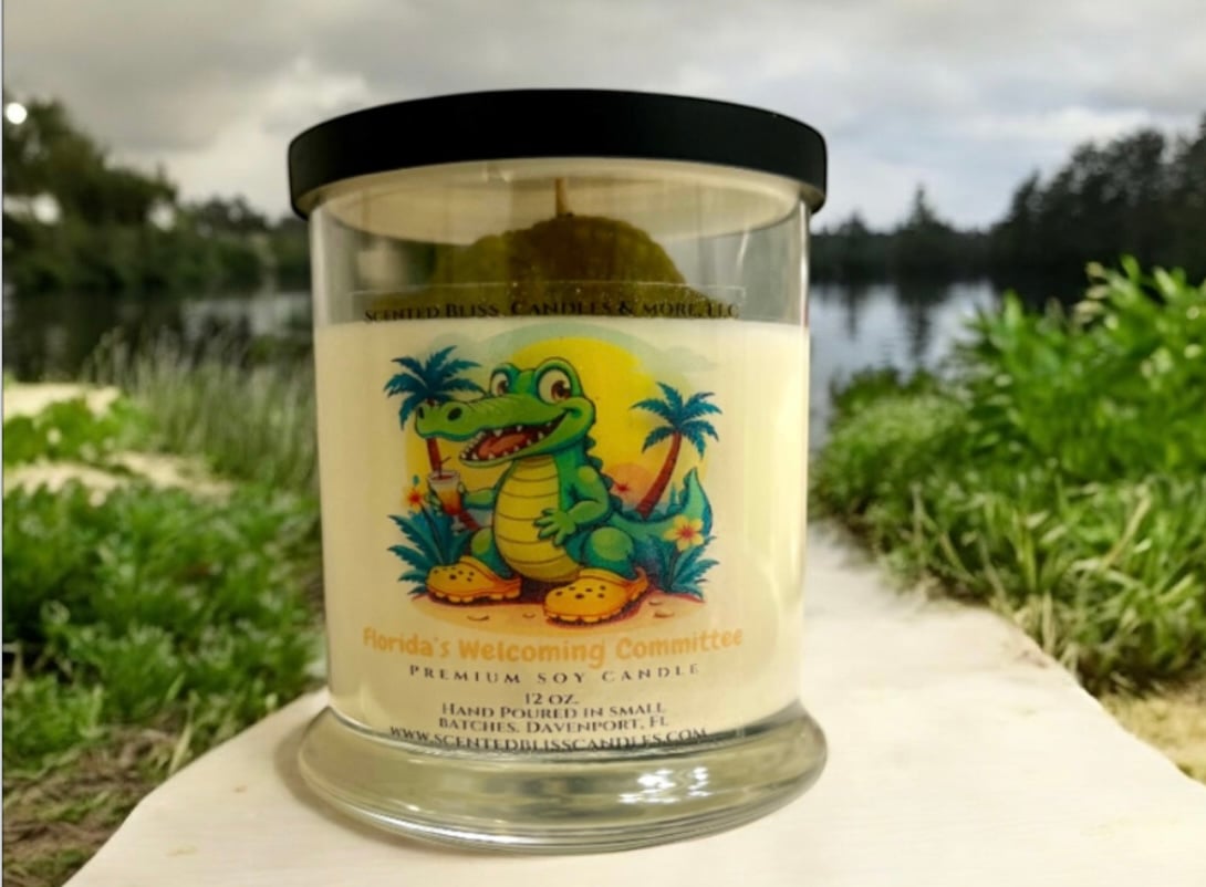 Our 12 oz Florida Welcoming Committee candle k about as cute as Alligators come . Scented in a “Florida” citrus scent this one is perfect for any Florida lover. These make great souvenirs, and holiday gift. .