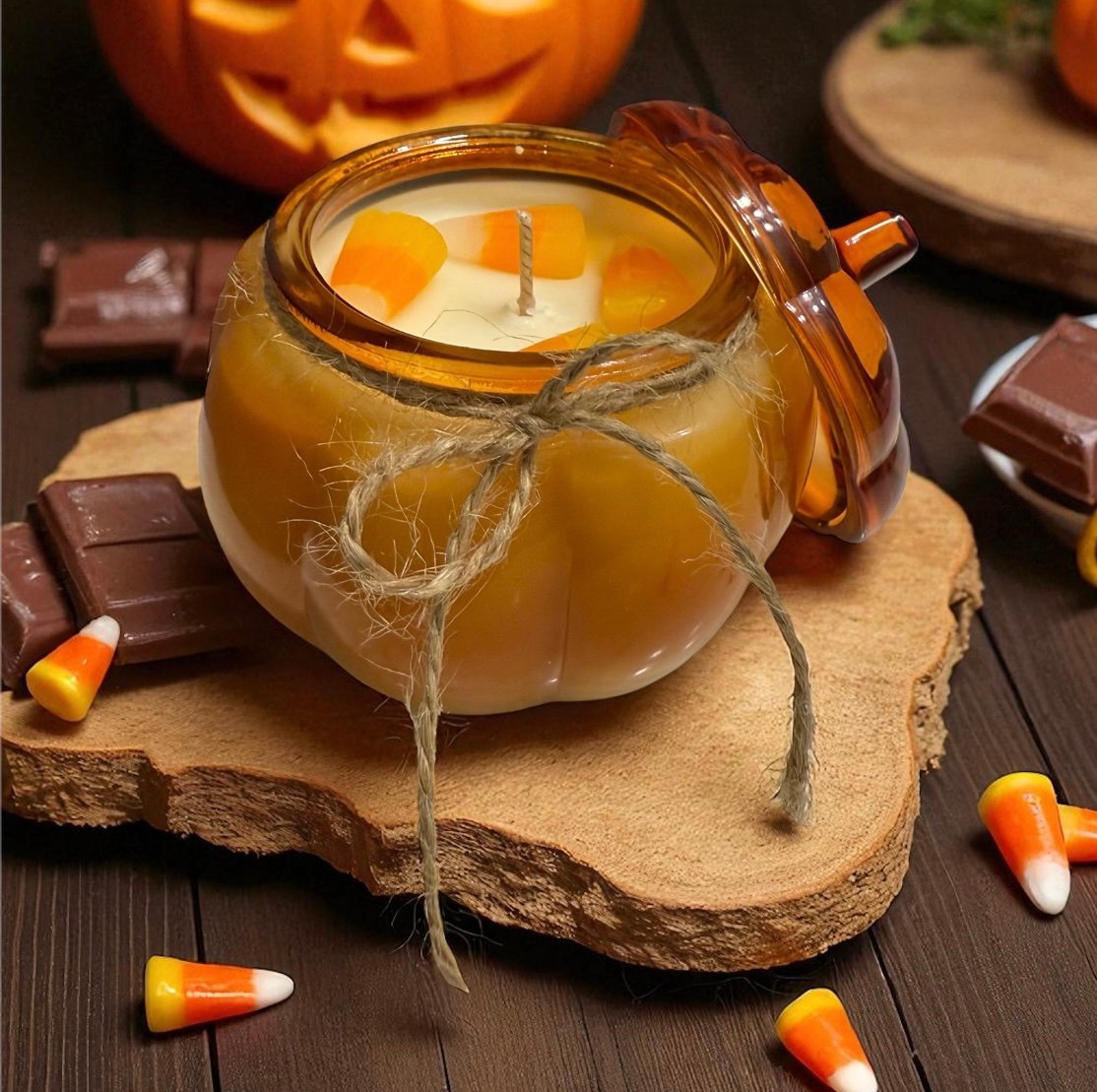Comes in a beautiful pumpkin shaped glass jar that can be reused as decor, a candy /cookie jar or a centerpiece for seasons to come.