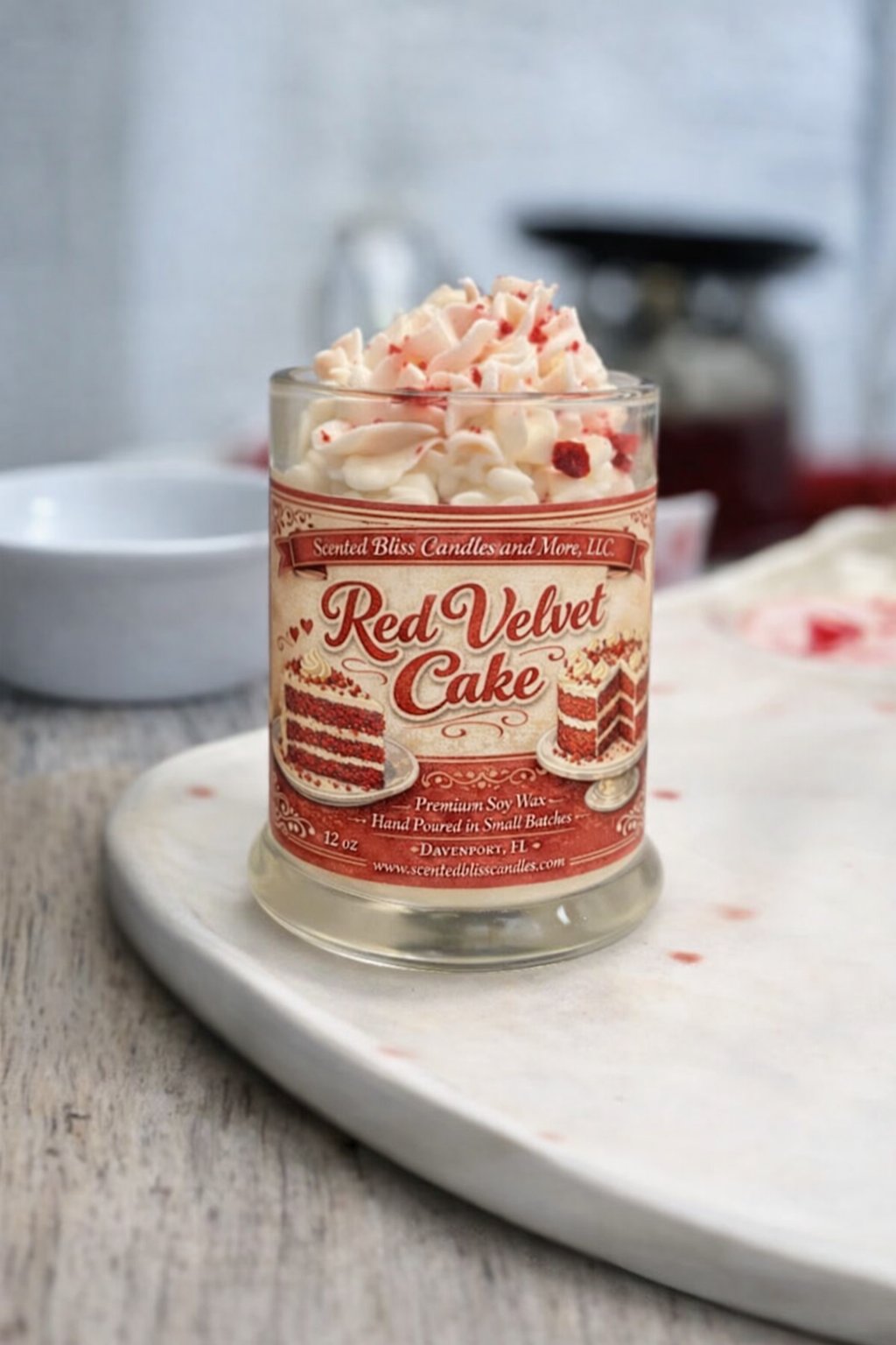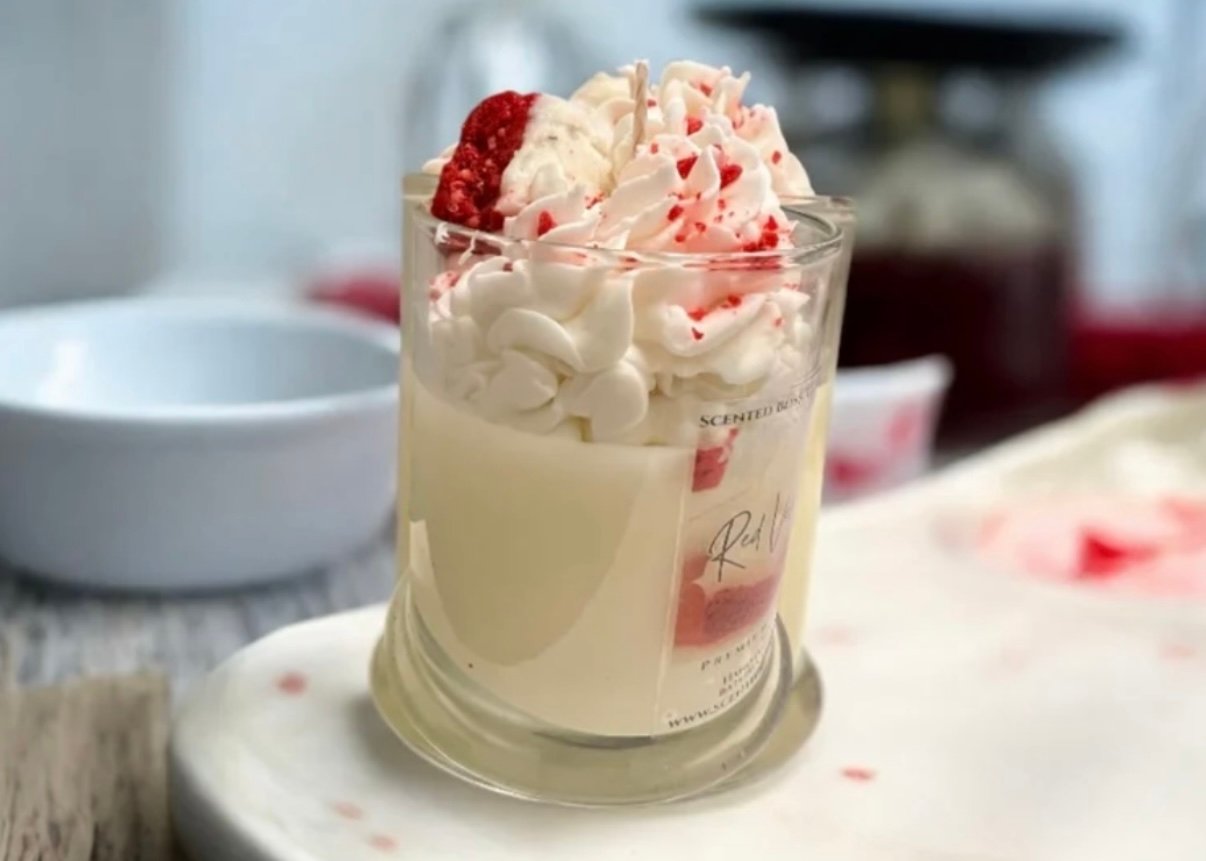 Our 12.5 oz red velvet cake candle scented in almond and velvety buttercream blend seamlessly with the decadent scent of chocolate cake, while a touch of ripe berries adds a subtle fruity twist. Creamy coconut and smooth vanilla bean enhance the sweetness, creating a truly luxurious and mouthwatering aroma